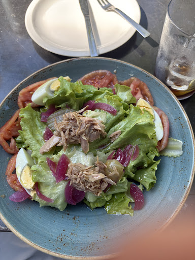 My wife and I went to lunch at this pintxos bar and restaurant serving typical Basque cuisine located on San Pedro Street in Hondarribia, one of the town's most historic streets. We had an open-air table on the outdoor terrace overlooking the street. At this restaurant, you can enjoy traditional Basque dishes for breakfast and lunch, as well as pintxos, the typical tapas of the Basque Country. We ordered a tortilla pintxo to share and a mixed salad. The pintxo wasn't cooked properly, but the moxo brought us another one, and the salad was delicious. We would like to thank the Rolling Stones waiter who helped us find a table and was welcoming, smiling, friendly, competent, cordial, and helpful. The service was attentive and fast, and the prices were...