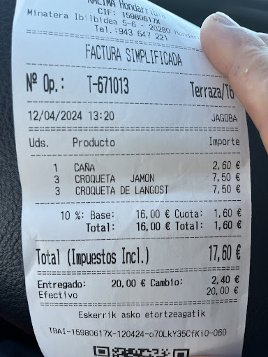 Read moreHemos venido a pasar el día a Hondarribia. Tras dar un paseo y llegar a la zona del puerto, encontramos este garito... Sinceramente hemos acabado ahí de rebote ya que el resto estaban llenos. Total que acabamos comiendo aquí, al ver que contaban con menú y ya que no era muy pronto(las 15:15) Nos dijeron que esperasemos 15 minutos, así que nos sentamos mientras fuera a tomar algo, pensando que ya tendrían la mesa montada una vez pasara este tiempo. Total, que entramos y la mesa todavía estaba sin montar. No había más que una mesa dentro ocupada, fuera es verdad que había algo más de gente comiendo, pero vaya, que tampoco eran tanto el trabajo que tenían. Nos sentamos mientras y nada, pasaban los minutos y nadie venía a preparar la mesa, enseñarnos el menú... Etc Sin ser exagerada transcurrieron unos 10/15 min sin que se acercarán tan si quiera. Y lo irónico es que había unos 5,6 camareros, muchos de ellos pululando por la barra, y nosotros alucinando del ritmo caribeño que llevaban. No tenían ni ansias ni ganas de trabajar o esa era la impresión, a punto de levantarnos todos para irnos, uno de nosotros ha acudido a hablar con uno de los trabajadores y ya por fin, nos acaban atendiendo. La comida, no estaba mal, pasable, sencilla (Por 19,90€ tampoco se puede pedir milagros) pero los tiempos de espera... En fin, parecía que tenías que amontonar los platos para que vendrían a recogerlos y traer lo siguiente... Sólo puedo destacar que el último camarero que nos ha atendido era el más atento y agradable. Es increíble cómo hoy en día se contrata a muchisima gente sin experiencia, que no lo veo el mayor problema, pero si la falta de ganas, decisión y rapidez. Una pena, porque el sitio no está mal, es amplio pero.. ETERNOS TIEMPOS DE...