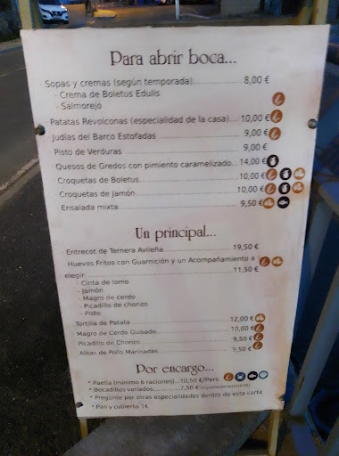 Read moreMuy agradables en el trato. Estamos alojados en un hotel del pueblo y hemos ido a cenar mi marido y yo. Al entrar, la persona que nos ha recibido ha sido súper agradable ofreciéndonos mesa alta o baja y buscando un sitio para los dos. Luego con el camarero que nos ha tomado nota ha tenido un detalle muy bueno: he pedido media ración de pisto y pese a que estaba bueno, el género estaba bien pero no era lo que yo esperaba (más tipo pisto manchego) y no me ha gustado. Cuando hemos pedido del postre, ha visto que no había tocado apenas el plato y se interesado por saber si es que no había sido de mi agrado. Después cuando nos ha traído la cuenta me ha dicho que el pisto no lo habían cobrado ya que no me lo había comido. Me ha parecido un gesto muy bueno, yo no había dicho nada porque lo había pedido y era asunto mio que no me gustará. Sin duda tienen muy buena atención con el cliente. Además he de decir que el resto de cosas estaban buenas. Sin duda...
