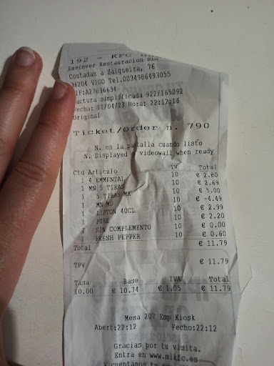 Read moreMala experiencia en este KFC. Sobre las 3:30 de la tarde de hoy una mesa de dos personas dentro y otra fuera ya atendidas solamente uy otra na mesa de tres y nosotros que éramos cinco no había nadie más en el local. ….Hice un pedido de más de 50 € en tres comandas , incluyendo unos helados, y cuando estaba en la barra para pedir que me los sirvieran después de la comida, ya me los habían puesto . Al pedir que me los guardaran, simplemente se negaron sin dar ninguna solución, total falta de empatía hacia el cliente por parte de la chica morena de la barra, tuvimos que tomarnos los helados totalmente casi descongelados después de comer ..Además, el local estaba con casi todas las mesas llenas de restos de comida y sin limpiar., El servicio dejó mucho que desear: empleados poco atentos y con mala actitud. No volveré a este establecimiento. Por favor, no hace falta que me respondan con la contestación de siempre a todos, que si envíen al e-mail más datos o más detalles Yo creo que con los detalles que le he contado y todas las reseñas negativas que tienen, deberían de darle una solución para no volver a tener más reseñas...
