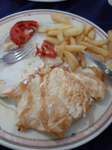Dos primeros: Sopa de marisco de muy buen sabor, pero con poco pescado y marisco. Tres bolas de ensaladilla rusa sobre hojas de lechuga. La ensaldilla de muy buen sabor, pero demasiado machacada. Exceso de patatas y falta de otros ingredientes. De hay tal vez el exceso de machacado. Dos segundos: Churrasco. Dos piezas con un corte muy fino, acompañados por patatas fritas, y verduras (¿de bolsa?) cocidas. La carne, bien hecha. Ni pasada, ni cruda. Sardinas asadas. Tres piezas acompañadas por verduras del mismo tipo. Postre: 1 Rodaja de sandía bien servida y un flan de huevo, que si algo tengo que criticar, es un exceso de azúcar. Para los muy golosos ideal. No obstante, me ha gustado mucho. El comedor, muy amplio y agradable. Sin agobios entre las mesas y las sillas vestidas. Decir que si las raciones fuesen un poco más generosas, o hubiesen preguntado si quería repetir (que no lo hubiese hecho, mi mujer tampoco, mi valoración hubiese sido de cuatro. Como menú, ofrecieron, creo recordar que cinco primeros y cinco segundos. Con variedad. También variedad en postres.