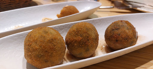 Read moreDos locales diferentes, con terrazas diferentes, cartas diferentes conectados por el interior. Pero aunque sean diferentes puedes pedir de cualquiera de las dos cartas. Aunque esté escribiendo en la Traviesa, nos sentamos en la terraza de Gran Vía 1, y fue de la carta de éste de la que pedimos casi todo. La atención del personal muy bien, rápidos y amables. Las comida genial también y todo muy bueno. Las croquetas estaban muy ricas, tanto las de carrilleras con chocolate blanco como las de espinacas, gorgonzola y piñones, en estas últimas el piñón no se notaba y el sabor que salía era de un suave gorgonzola. Pedimos también tapa de ensaladilla de pulpo, y realmente tenía bastante pulpo, cosa que se agradece. También pedimos el Brioche, que fue lo único que vimos un poco justo para el precio, uns Smash burguer gourmet de la carta la de Traviesa (Hamburguesa de ternera con queso chedar y crema de ajo tostado y cebolla frita), y una ensalada fresca de gambones con fruta, muy buena, con toque dulzón y crujiente. Eramos 3 y no pudimos con todo. El servicio es 1.30 por persona e incluye pan calentito y bolsa de picos. Relación calidad precio está muy bien, la ubicación es estupenda, y sin...