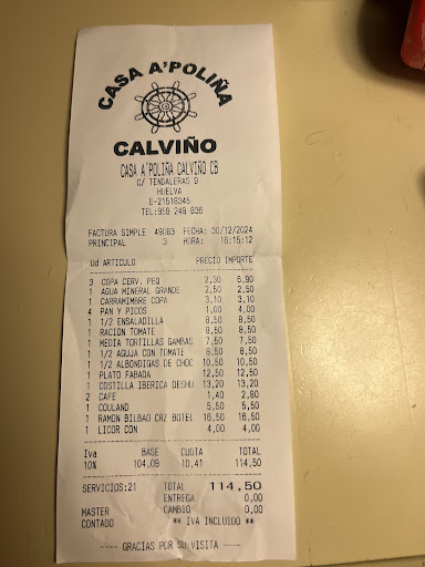 Read moreCasa A'poliña Calviño es un pequeño restaurante con nombre gallego, aunque su comida es muy variada.
