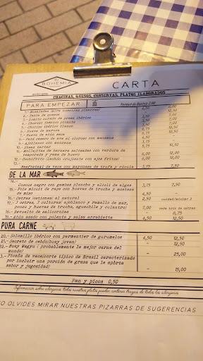La Bohemia tiene una carta algo corta en platos, pero con una elaboración muy cuidada en todos y cada uno de ellos. Todo te llama la atención, y es difícil de elegir. Nosotros nos decantamos por un cuscus negro de gambas con alioli de algas, atún asado con polenta, merluza de pincho al carbón y solomillo ibérico sobre parmentier de gurumelos. Todo buenísimo. Destaco también el trato exquisito de los camareros a la hora de exponer las recomendaciones de la carta y durante la comida.