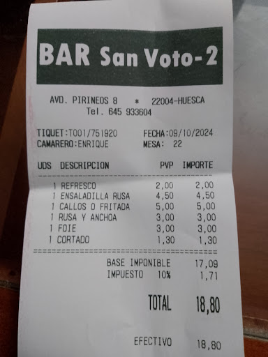 El camarero y la camarera amables, pero las pulgas son enanas, ridículas, diría yo y la tortilla congelada de las que compras en el supermercado……, cosa que parece bastante extraña en un bar de tapas tan conocido como este, pedí una pulga más grande ( porque repito, son ridiculas) y me cobraron según el ticket, medio bocadillo, que era una pulga de tamaño normal, al módico precio de 3,90…., nada que ver con las fotos que veo publicadas, no sé si es que hoy se habían quedado sin pan….. el café con leche 1,60…. Excesivo para estar en la avenida pirineos y una infusión 1,80…. En fin, no volveremos claramente. Un picho de tortilla congelada Una pulga ( según ellos medio bocadillo) Dos cafés con leche Y una infusión 13...
