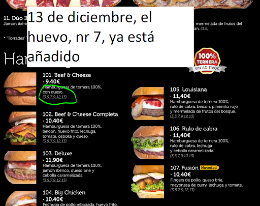 Ese 3 de diciembre, volvimos a pedir la misma hamburguesa, volvimos a comprobar los alérgenos, y todo seguía igual, SIN HUEVO. Pero para mi desgracia, algo habia cambiado. Tras ir comiendo la hamburguesa me empecé a encontrar mal ( como la típica reacción al huevo) y ya empezamos a sospechar de que el pan de la hamburguesa podía contener huevo.