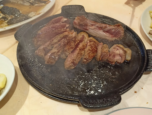 Read moreAmbiente familiar, mesa y silla cómoda, servicio impecable, muy muy atentos. Decoración que pasa completamente desapercibida. Raciones abundantes, unos pimientos con anchoas muy buenos, callos suaves y sabrosos, el rodaballo excelente. Pero no se puede sacar a la mesa un chuletón humeante con tanto aceite salpicando y quemando, te queda la ropa imposible y las gotas hirvientes te queman las manos aparte del humo en la sala, a pesar de que pusieron el aire acondicionado. Por eso no doy la estrella 5. La comida es muy buena, pero el ambiente no es como para agasajar a un invitado. Mejoraría cuidando eso...