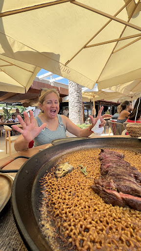 I was quite disappointed to come here and found that they do not serve paella unless you order for two people. I ordered the grilled octopus and was good, although the portions are so small (just a few roasted veggies and some celery pure) and the place is quite overpriced (like everywhere in Ibiza). They charge you for everything, including the most expensive bottled water I’ve ever had. However, the best part of the menu was the dessert. They suggested me to try the “torrija” and I couldn’t asked for a better option. It is a sort of Spanish version of french toast with custard cream and perfectly warmed. Amazing. Definitely would come back only for it. The restaurant is in front of the beach and that is beautiful. You can even rent daily umbrellas and beach seats in front of the restaurant where they can serve you food and drinks. 15 euros for the seat and 15...