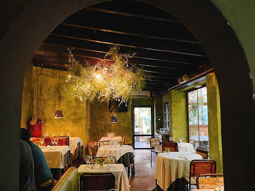 The restaurant’s exterior modestly conceals its inner beauty. As you step in, you’re greeted by an exquisite courtyard dining area canopied with ancient wisteria, its old Spanish-style tables inlaid with tiles and adorned with fresh flowers. The interior is just as mesmerizing, with a pristine old wooden bar and tables draped in thick white linen, all under the warm glow of subtle lamp lighting.