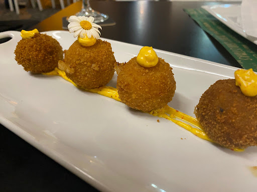 The fish croquetas were delightful, though presented more like Dutch 'Bitterballen', they were satisfying. The smoked cheese was well-paired with papaya, creating a tasty combination. The blood sausage came with a sweet sauce, though the dishes overall leaned a bit too much towards sweetness for my taste. While the textures were pleasing and the flavors decent, a bit more spice and seasoning would elevate the experience. Less sweetness is desired.