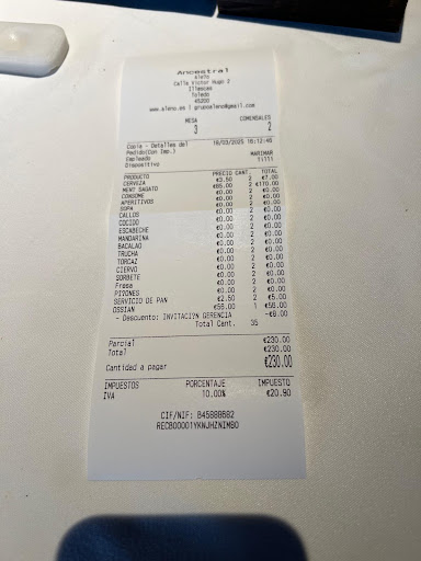 Pedimos la cuenta porque desde luego no pensaba pagar esas cantidades para tener que tirar comida o comer lo que no me apetecía. Me la trajeron (casi 10 euros por una cerveza, un vino blanco y una Fanta) y solicité hablar con la metre.