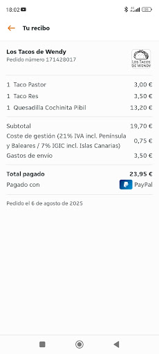Read moreSinceramente la peor comida de mi vida. No se si variará mucho a domicilio como en el local pero puedo afirmar que a domicilio es basura. La carne dura. De verdad incomible. Ni a los perros se la echo. Una vergüenza q sirvan a Domicilio esa comida. Pues es los mismos tacos de Wendy donde pedí yo porque tienes un enlace que va a Just eat que es donde pedí yo. Por lo menos podías mostrar interés en ver q pudo pasar porque yo hablo de mi pedido y era imposible de comer y nodevur q es otro restaurante. Quizá allí se coma bien no lo se porque no fui pero yo te hablo de mi pedido y tire la mitad así que comentario de odio nada. Es mi experiencia y si quieres te paso el ticket de just eat y una foto de medua quesadilla q deje pero no creo q te interese por tu respuesta. Pues mira ahí tienes el ticket y parte de lo q mandaste a ver si tiene el mismo aspecto q las otras fotos de otros clientes. Y te aseguro q es tu restaurante porque colo dije el enlace de just eat Va a La página donde yo pedí. Así q que menos q disculpas e interesarte por lo...