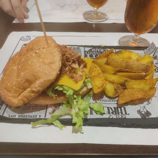 Tiene una gran variedad de platos en la carta, de un precio medio, pero buena calidad, desde raciones, hamburguesas, comida mexicana, tostas, etc..., Además de una amplia carta de cervezas, incluidas las 0'0 de estrella galicia, yo recomiendo los tacos, son 8 euros y se come bien, la hamburguesa no te va a satisfacer tanto como los tacos, raciones las patatas queso y los nachos están riquísimos. Como anotación extra, cuentan con futbolín y una terraza bastante grande, si te tomas una cerveza te darán una...