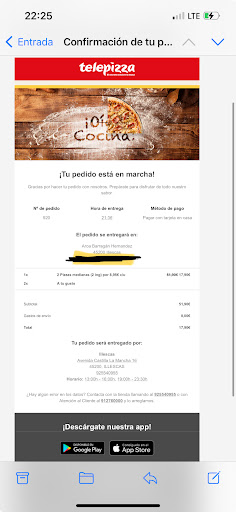 Vuelvo a llamar a las 22:00h y me informan de que no encuentran mi pedido. Al final me dicen que sigue en tienda, el repartidor no ha cogido mi pedido y sigue en la tienda.