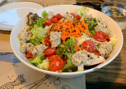 Buscando de camino a casa un restaurante para cenar pronto, encontré en Google este local. No es habitual que puedas cenar antes de las 9 de la noche, así que nos acercamos sin grandes expectativas. La sorpresa fue que desde el primer momento nos dió muy buena impresión el recibimiento y la atención. Hay una terraza estupenda, aunque en el interior se está genial con unas cristaleras enormes. En la carta tienen ensaladas, hamburguesas, pizzas, croquetas, empanadillas argentinas, nachos, alitas, etc. Vamos que seguro que algo te cuadra. Pedimos de entrante una ensalada con lechuga, tomates cherry, queso de anacardos y aliño de aceituna negra. Hacía tiempo que no tomaba una ensalada tan sencilla y a la vez tan rica. La empanadilla de carne estaba buena pero la de cebolla caramelizada con queso de cabra y nueces todavía mejor. Para terminar optamos por las alitas de pollo que venían con una salsa que se me olvidó preguntar qué llevaba, pero era como un tipo de mayonesa muy rica. Lo que iba a ser un alto en el camino sin más se convirtió en una agradable cena. ¡Cómo se nota cuando las cosas se hacen con cariño! Suerte y a seguir...