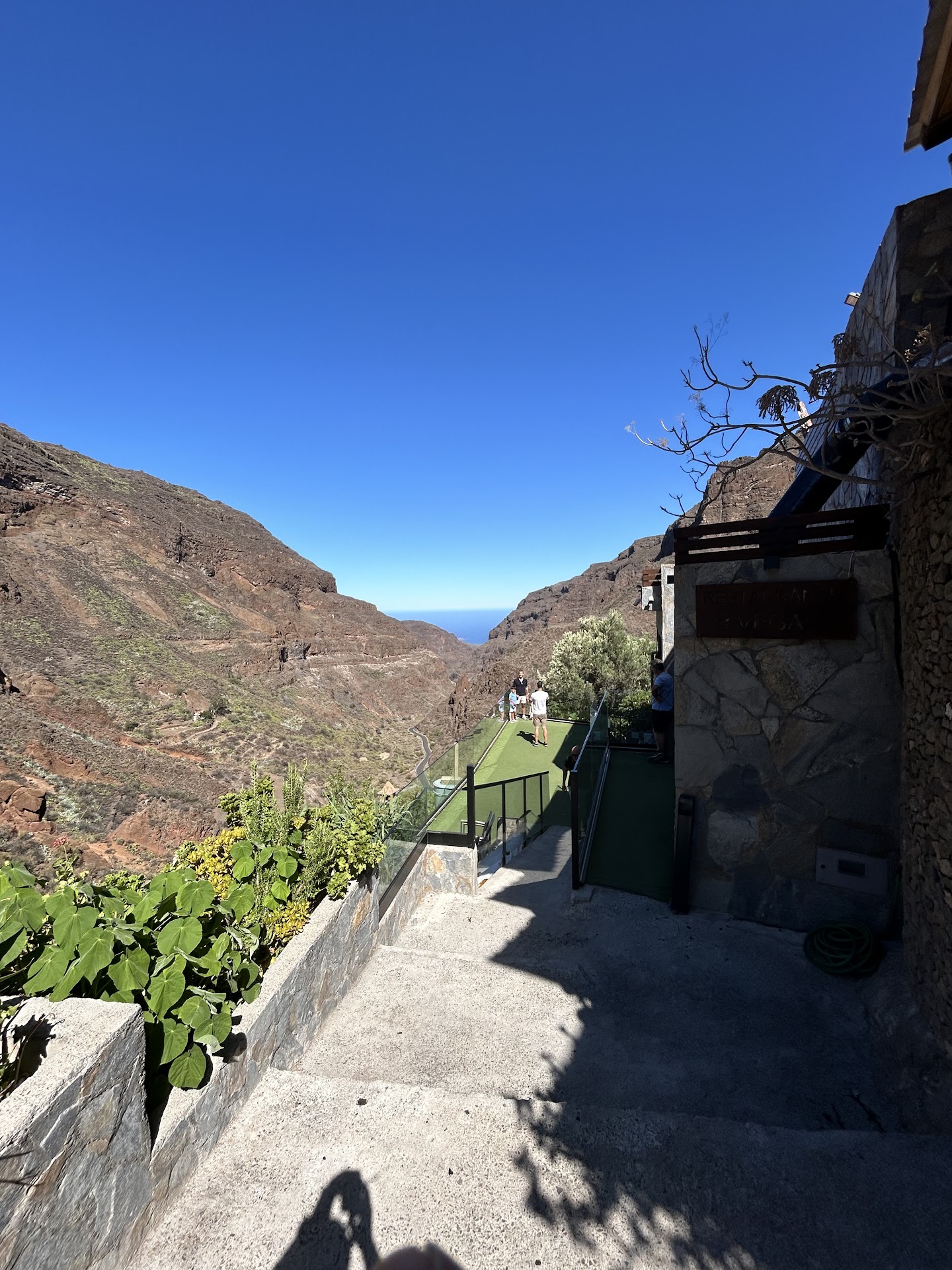 A lovely drive up through the Guayadeque Ravine on the GC103 basically as far as you can go and the restaurant sits at the top of the ravine with a lovely view back down towards the coast .