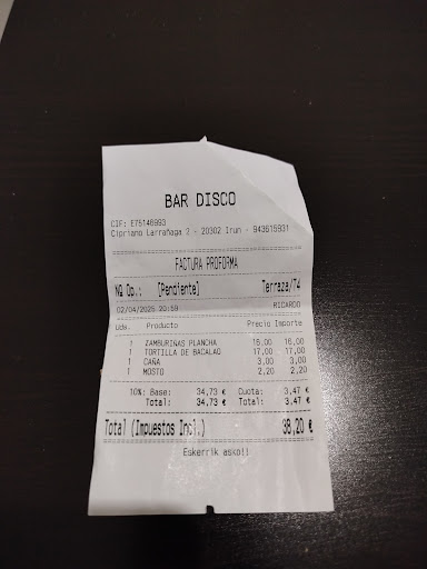 Read moreFuimos a cenar y pedimos zamburiñas que eran un poco pequeñas y tortilla de bacalao que no estaba en su punto.Pedimos la cuenta y nos cobran 17 e la tortilla cuando en la carta pone 12 e .Le preguntas al camarero y te dice qué es para 2 personas.El precio que pone en la carta da igual que sea para uno o para 10 personas ya que no específica nada en dicha carta y si no que lo pongan.Si se piensan que somos turistas se an vuelto a confundir,me parece que es de tener la cara muy dura.Y por favor no respondáis eso porque os ponga la foto de la carta y vemos...