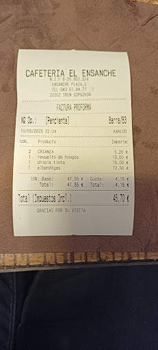 Read moreLamentable lo que ocurrió ayer (24 de junio de 2023). Reservamos para cenar a las 22:00-22:30. Llegamos un poco antes de las 22:30. Nos dicen que tenemos que esperar para cenar “unos 45 minutos”. Nos dejaron tirados. Encima, en un día como ese, que todo el mundo sale a cenar fuera en Irun, por las fiestas. Falta de profesionalidad impresionante. Muy lamentable. Evidentemente no iré a este restaurante y a mis conocidos, cuando lo recuerde, comentaré lo sucedido. Por suerte, encontramos un lugar para cenar un plato combinado sin tener que esperar casi a las 12...