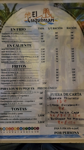 Read moreFui junto a mi pareja la noche de ayer sábado a tomar unas tapas ya que las referencias vistas en internet eran bastante buenas del sitio y de la calidad del producto. Mi sorpresa fue que, al sentarme en el establecimiento, me comenta el camarero que no sirven comida, sino que es una cafetería simplemente para tomar café o alguna otra bebida. Con todo mi asombro tuve que marcharme a otro lugar. Entonces mi pregunta es la siguiente: ¿Es o no El Cuquiman un bar para tapear? Sigo viendo fotografías de las tapas en internet y buenas opiniones del servicio y de la comida, entonces estoy algo asombrado y dubitativo. Lo intentaré de nuevo si consigo enterarme...