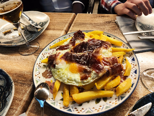 🟢 Huevos rotos con jamón ibérico cortado 🍳: Cada vez que leo "huevos rotos" me espero una sartén con sus patatas a lo pobre y sus huevos encima. Y esta vez fueron patatas fritas lo que me encontré (fallo mío por no preguntar). El plato trae suficiente jamón y 4 huevos fritos. No vas a pillar una patata sola. Precio: 15,00 €. Valoración: 7/10 (por no ser patatas a lo pobre).