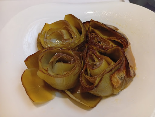 Elegimos para comenzar unas alcachofas confitadas que estaban espectaculares y un canelón de langostinos que fue todo un acierto, elegante y sabroso. De segundo, una butifarra blanca a la brasa, jugosa y perfectamente cocinada, y unas manitas de ministro guisadas que nos dejaron sin palabras: sabrosas, melosas, y con esa potencia de sabor que solo se consigue con mucha experiencia y dedicación.