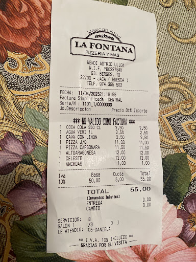 Read moreHe ido esta noche a cenar con mi pareja en La Fontana. Lo que esperaba que fuera una cena tranquila se ha convertido en una cena muy desagradable. El cocinero ha hecho un comentario MUY DESPECTIVO a la mesa de al lado sobre los catalanes y Cataluña, pero lo ha dicho tan fuerte que no ha pasado desapercibido. No voy a reproducir sus palabras por educación, pero para todas aquellas personas que cuando buscan un sitio para comer/cenar y no solo tengan en cuenta la comida, sino el servicio, la atención y sobre todo, el respeto y la educación, les digo que ese no es el sitio adecuado. Soy consciente de que existen muchas opiniones y muy diversas sobre la situación actual en Cataluña, pero cuando vas a un restaurante lo que buscas es disfrutar de la comida, no escuchar las barbaridades de las que hoy he sido testigo. PD. Las pizzas son más bien pequeñas y muy normales. Sin duda alguna no pienso volver...