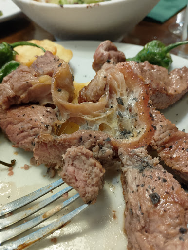 Decidimos ir a comer a este restaurante porque en otras ocasiones habíamos entrado a tomar algo y vimos como servían chuletones a la piedra con muy buena pinta. Para nuestra sorpresa nuestras expectativas no se cumplieron , en primer lugar el servicio lo describiría como caótico (muy mala gestión) cuando la chica viene a tomarnos nota nos dice que faltan casi todos los entrantes de la carta , le preguntamos que si podemos pedir un chuletón( tuvimos que preguntarle en 3 ocasiones) y ella nos recomienda y nos insiste en que el entrecot es muy bueno , tanta fue la insistencia que lo pedimos . Nos quedamos atónitos cuando llegó a la mesa, os dejo la foto, estaba cocido , basto ,lleno de nervios ( como si cocinas un producto que está sin terminar de descongelar y con el agua que saca se cuece ) 23€ . En cambio la costilla de cerdo a la barbacoa si que estaba muy buena se deshacía todo acompañado de patatas naturales El establecimiento estaba lleno de moscas y sin aire acondicionado. Las raciones...