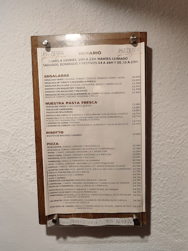 Tienen ensaladas, pastas, risotto y su fuerte, las pizzas, estás últimas son muy variadas y todo el mundo puede encontrar una que le apetezca.