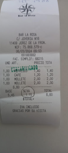 Read moreMis trabajadores me traen 2 tickets de este establecimiento y cuando los voy a contabilizar no aparece el porcentaje de IVA que tienen que cobrar, que en hostelería es el 10% y resulta que están cobrando el 21%. Esto es aviso a navegantes porque desde luego los voy a denunciar. Que estoy de listiillos hasta el moño. Y pongo 1 estrella porque sin poner al menos 1 no me deja publicar. Adjunto foto para quien quiera...