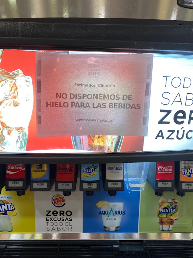 Read moreDe vergüenza! Fuimos a comer a las 21:45 h a cenar. Pedimos y nos sentamos en unas mesas, Un trabajador levantó unos clientes ya que las sillas que están recogidas no se pueden sentar. Donde come? (Si no quieren que se sienten a cenar lo normal es que cerréis las máquinas para que los clientes no pidan comidas) Cuando tenemos nosotros las hamburguesas vamos a las máquinas de bebida y sorpresa! No hay hielo ni bebida ( Coca cola, Fanta ... ) nada . Le pregunto a un trabajador y me dice que se ha acabado y que hasta mañana que reciban el camión no hay ( Oleeee, pero las maquinas siguen vendiendo... ) Pagamos por comida y bebida pero no hay? Me parece falta de previsión... Pero las maquinas siguen vendiendo hasta que se ponen fuera de servicio. Entre la limpieza ( Fatal ) trato al cliente ( Penoso ) y falta de previsión. Ya no voy más a ese burguer King. Hay otros en la zona de jerez que no tiene...