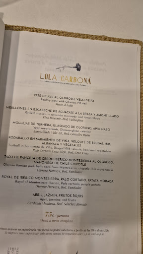 La reserva en el restaurante fue a través de su perfil de Instagram, respondiendo enseguida a la petición. Nos presentamos en el local un poco antes de las 14 horas, estando prácticamente vacío (aunque poco a poco se fue llenando, incluso alguna mesa con doble ocupación, algo que me parece meritorio en esta época de COVID...). El restaurante se encuentra en un amplio local que funcionó en su momento como bodega de vinos de Jerez, pudiendo observar las antiguas vigas y algunas de las botas. Como ese mismo día era nuestro aniversario, decidimos celebrarlo a lo grande pidiendo el menú largo, acuñado Solera, que incluye maridaje con vinos de Jerez. Paso a relataros las delicias que nos sirvieron: -Paté de ave con velo de Pedro Ximenez con vermú rojo de González Byass -Para mi acompañante tartar de langostino con velo flor y ajoblanco de ajo negro, para mí, como soy alérgica a los crustáceos, prepararon un riquísimo Tartar de tomates de Conil soasados a la brasa con guacamole, ambos platos acompañados por Manzanilla en rama Arboledilla Poniente, de Barbadillo -Vainas verdes a la carbonara de atún de almadraba con Fino Cruz Vieja, saca exclusiva para La Carboná, de Bodegas Faustino González -Mollejas de ternera glaseadas con Palo Cortado, apionabo y vegetales con Amontillado del Duque, de la Bodega Gonzalez Byass. Además nos invitaron a un par de copas de una de nuestras bodegas de Jerez favoritas, Urium. -Rodaballo con velouté de Palo Cortado y wok de vegetales (el pesacado es de lo mejor que he comido nunca, y eso que vivimos en Galicia) con oloroso Lorente Barba -Rulo de cordero a baja temperatura con Ras al hanout, alcaparras encurtidas en oloroso y flores con Harvey's Cream -Cítrico pasión: bizcocho de limón, crema de cítricos y fruta de la pasión con Brandy Fundador Triple madera solera Gran Reserva -Chocobrandy: bizcocho de cacao con helado de Brandy de Jerez, espuma de chocolate amargo y crujiente de Toblerone con Cruz Vieja elaborado a base de Pedro Ximenez por Bodegas Faustino González Tras la comida nos permitieron entrar en la bodega para ver el velo flor, que se encontraba en frascos de cultivo celular, como los que se usan en laboratorio. Con dicho velo preparan, como habéis podido comprobar, pan, salsas, etc. Por cierto, el chef salió varias veces a comprobar que las mesas estuviesen a gusto y pudimos hablar con él unos minutos; se llama Javier Muñoz Soto y se trata del hijo de los fundadores (de hecho nos pareció muy joven), quienes abrieron el restaurante por 1994, como asador de carnes. Gracias a la incorporación de Javier, la carta y el estilo han evolucionado, pero siempre con el vino de Jerez como base de la mayoría de los platos, de ahí que le apoden el "Chef del Sherry".