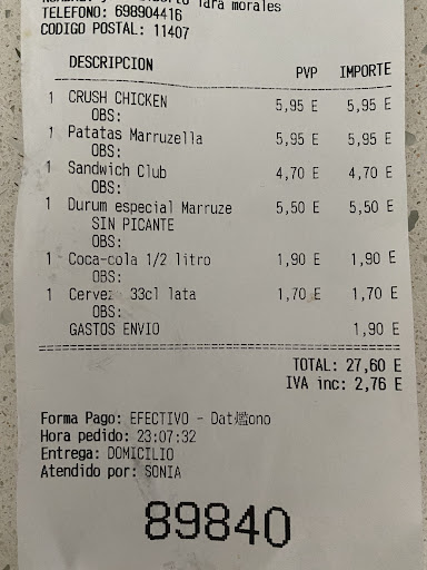 Read moreLlevo años pidiendo a Marruzella siempre me ha encantado la comida y el trato hasta hoy… el lunes día 11/04 hicimos un pedido en el cual nos faltaron las bebidas (una Coca-Cola y una lata de cerveza) cuando nos dimos cuenta el chico se estaba yendo con la moto y no nos llegó a oír así que llamamamos pero eran las 00:12 y nadie nos cogio el teléfono. Tras 10 minutos de espera colgamos. Al día siguiente día 12/04 trabaje todo el día y por la tarde no me acorde de llamar así que lo acabo de hacer día 13/04 a lo que dos empleados (ya que el primero me dice que lo va a comentar con la encargada y se cuelga la llamada) la segunda chica me dice que tendría que haberlo comentado en el momento (imposible ya que no estaban abiertos ya y por lo tanto el teléfono no lo atienden) o al día siguiente… con lo cual esos 1,9€ y 1,7€ me los como yo por mi “olvido” y no nadie por el “olvido” de entregar el pedido porque cobrado si que está,m. Lo único que quería era que constara para que en el siguiente pedido me lo trajeran, ni si quiera molestarles en que me lo acercaran ahora, a lo cual tengo derecho, pero me dicen que no a lo que le reclamo que tendrá manera de ver que les sobró ese día o que podrán mirarlo en stock pero la chica que no si quiera me contesta sino que me dice que tiene que ser en el momento o al día siguiente… la hostia… así que nada, en cuanto mi trabajo me lo permita dejaré en su local la reclamación pertinente y evidentemente ha perdido más de un cliente por una cantidad absurda y por la poca...