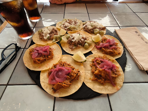 Pésima comida. Pésimo servicio, nos sentamos en una mesa interior y nadie se acercó a atendernos, tampoco hay letreros ni nos informaron de que tuviéramos que pedir en barra. Los empleados no son simpáticos, parecen enfadados por tener que trabajar. Como información extra, los baños dentro del restaurante son sucios y no tienen papel higiénico. Lo peor de todo son esos tacos insipidos. Como mexicana puedo decir que jamás volvería. Ni siquiera nos ofrecieron salsa picantes, no tenían chilaquiles a pesar de ofrecerlos en la carta, su pretexto es que se terminaron, ya claro, a las dos de la tarde y en un lugar vacío se les acabó. Y la mayor de las desgracias es esa forma de servir tacos de mole, mezclar mole con guacamole es algo impensable en México. Los tacos de arrachera tienen carne de mala calidad y ni siquiera llevaba cebolla ni cilantro, eran una triste tortilla con carne dura. Como sabrán los mexicanos, los taquitos llevan doble tortilla, pues en este lugar es una tortilla fría que se deshace al tocarla (y por tortilla me refiero a lo que en España llaman "tortita"). Los tacos de mole aguado eran insipidos y el sabor del mole se perdió en la rara mezcla que hicieron con el guacamole. Los tacos de cochinita pibil son una decepción. Y esos tacos al pastor fueron lo único rescatable, pero solamente si los comparamos con los tacos de cinco pesos del metro. Los tacos los sirven en unos pesados platos que recuerdan a la piedra de los molcajetes, sin embargo son demasiado pesados, incómodos de usar y no parece que sean muy higiénicos en ese lugar. La verdad es que en las taquerías de México se usas platos normales, es la primera vez que veo esas cosas...