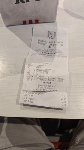 Read moreCuento mi experiencia hoy 14 de agosto, pedido por Glovo, XQZNHYY1, es este establecimiento, pedimos dos menús de 5 tiras de pollo, 1 lata a elegir y 1 unas patatas, la sorpresa es que cuando llega el pedido, nos faltan las tiras de pollo, 10 en total, tanto el repartidor como nosotros lo vemos en el pedido, el chaval me dice que me quede el pedido y reclame, mi sorpresa es que, yo no queria el dinero, 1 hora de espera, las 5 de la tarde casi, en casa, esperaba una solución, pues de un pedido de 15 euros, me descuentas sólo 4 euros por unas patatas y 1 lata de refresco, 11 euros, en fin he puesto reclamacion, me han cobrado el pedido, me he quedado sin almorzar, sin solución, entiendo errores humanos, pero no me explico que esto ocurra y no busquen arreglar la situación, no volveré a pedir más en glovo y tampoco nunca más comeré en este establecimiento de KFC, dantesco, penoso, esos errores son los que marcan los establecimientos, nunca se equivocan de más, no quiero nada de más, quiero sólo mi pedido, mal...