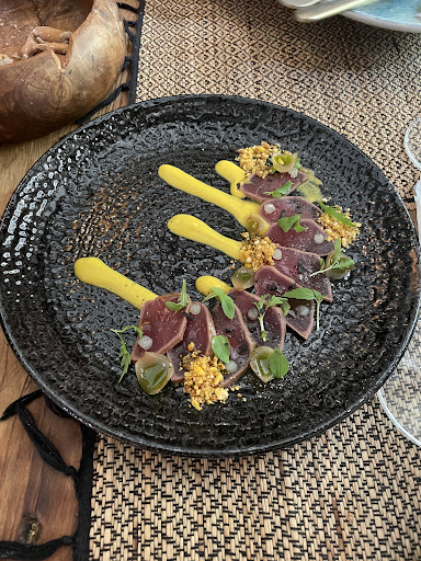 The restaurant is located in a very narrow street, with lots of plants and flowers that make it cozy and fresh. Inside, the restaurant is made out of stone with really high ceilings and a bohemian decoration. The menu is not traditional at all, but it’s cooked in a simple way. They use fresh ingredients in all their dishes. We ordered a Russian salad which was vey especial, with red onion and a soft mayonnaise. We did also ordered croquetas de centollo that where soft and super tasty. As a main dish to share, we chose the tuna with caponata and it was amazingly tasty, well cooked and soft. As a dessert, you need to try the chocolate coulant with pistachio ice cream, one of the best desserts I’ve tried not heavy at all. Definitely a place to go if you...