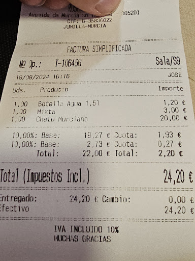 Read moreNo recomendable,un pésimo servicio,parece que les molesta que les preguntes algo,sobre todo la chica de gafas,le pedimos que repitiera el menú y puso los ojos en blanco,osea que clase de servicio quieren ofrecer,no tienen carta ,no saben lo que cuesta el menú,tardaron mucho en sacar alioli que lo pedimos muchas veces,la carne de cerdo la mía estaba rara de sabor,la de mi marido tenía olor a pescado y era Cordero,no se entiende. Las cosas no te las servían las tiraban de mala gana,estoy indignada porque paramos de un largo viaje con ganas de comer y descansar un rato y salimos de mal humor,además no te daban el ticket de lo que pagamos, porque según iba con el móvil. Espero que encuentren la verdadera vocación porque para la hostelería no están...