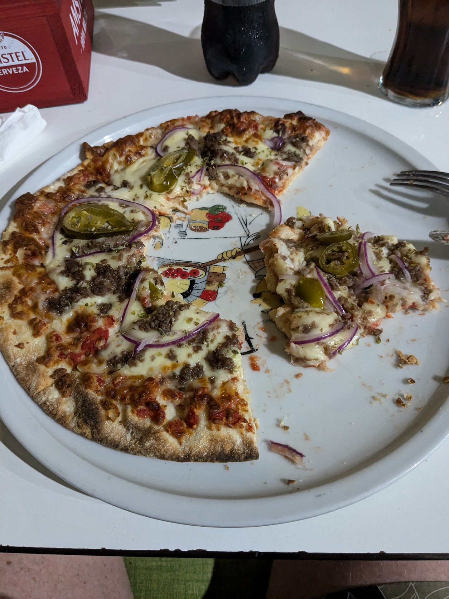 Pizzaen var selvsagt tørr kjøleskaps-pizza fra før helga, kald i midten og tørr langs kanten. Og kostet € 12.90 til sammenligning med pizza i hovedgata til under € 10. Vedlagt bilde viser den lunkne delen av pizaen som var spisbar hvis man spiste raskt. Pizzadeigen smakte forøvrig "billig".