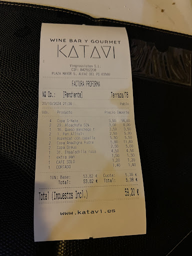 Visiting Kataví was an excellent choice. From the moment we arrived, we were greeted with impeccable service and a warm atmosphere that made us feel right at home. The restaurant is located in the beautiful Plaza Mayor of Alfas del Pi, adding a special charm to the experience.