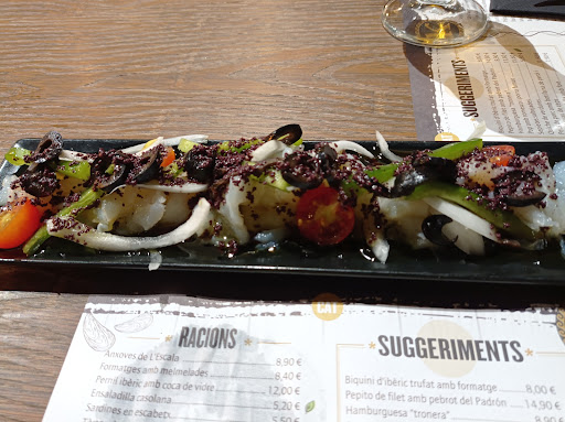Febrer 2022. Nova temporada, alguns plats renovats. Molt bo: humus de remolatxa, brioix de lluç. Bona com sempre la botifarra dolça amb poma Març 22, m'he animat a demanar el steak tàrtar. Molt bo, encertat de sabor i de picant.. repetiré segur... La coca d, escalivada... perfecte, Marc 22. Avui hem fet el menú de 17;50 euros. Molt correcte. Amanida de favetes o remenat amb llagostins i confit d'ànec. Abril 22. Natxos per compartir... correcte. Steak tàrtar: fabulós i amanida de formatge de cabra: espectacular de sabor. Servei amable, com sempre. Estiu 22. Hi hem anat vàries vegades. Han reduït una mica les racions, però segueix tot molt bo . Bon servei. Març 23. Kinoa amb un toc oriental i amanida de pollastre. Molt bo. Març 23. Paella....molt correcte. Juny 23. Menú. Amanida i paella. Avui la paella estava espectacular. Juliol 23. Croquetes i timbal de verdures, molt bo. Nachos... No sempre innovar és millorar.. el formatge fred, guacamole insípid... El servei...