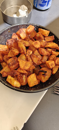 Reservamos un grupo de 20 amigos para un vermut y comer y la experiencia ha sido nefasta desde el inicio. Durante el proceso de reserva que nos generó mucho trabajo y diversas llamadas, nos llegaron a preguntar qué cuánto íbamos a consumir para ver si "les salía a cuenta" la reserva. Durante el día de la reserva se han equivocado trayendo tapas que no habíamos pedido, como una anchoa (una única anchoa!) para un grupo de 20. Absurdo todo. Cuando ha llegado el momento de comer, nos han querido quitar una mesa y dejarnos hacinados comiendo en un espacio ridículo...para poder deleitarnos con platos como sus bravas requemadas que podéis observar en la foto. Es un lugar donde te hacen sentir como una bolsa de monedas y no como un ser humano, donde lo único que importa es maximizar su beneficio y no la calidad o la satisfacción del cliente. Hay lugares mucho mejores en el barrio de Santa Eulalia, os recomiendo que busquéis otro sitio donde pasar un rato agradable con platos de más calidad a precios...