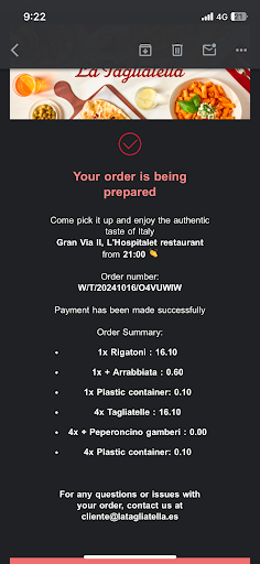 We arrived but the order was only for my friend and not for me which I ordered for 5 person! The supervisor or manager or whover is he “the bald guy” not even say sorry or nicety to us. He kept saying the order was not going through to their apps even saying “we have 2 la taglietalla” but the thing is we choose the addess at the right place in Gran Via II ! I assume only 1 restaurant there!