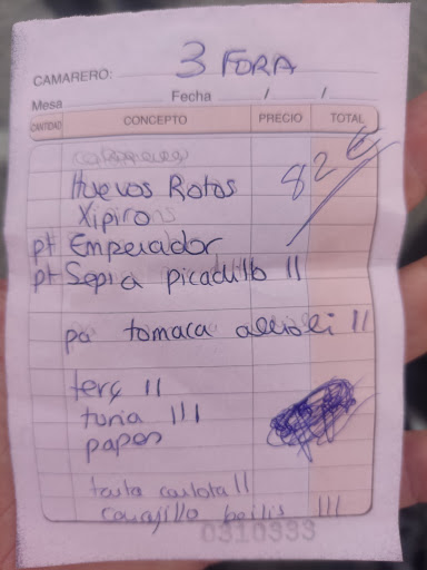 Hacía tiempo que no me clavaban de semejante manera!! Un barucho de pueblo donde unos huevos rotos los sirven con patatas fritas congeladas (estilo MacDonalds) y dos lonchas de jamón "de pegatina" del Mercadona, los tercios de cerveza a 3€ (ni saliendo de copas me cuestan eso), una mini bolsa de patatas fritas aparentemente por cortesía y que luego te cobran sin haberla pedido, la cesta de pan-corcho con dos mini cuencos de tomate rallado y allioli industrial 3€. El plato de chipirones con 4 chipirones contados en un plato sin más (en el sentido más estricto de la palabra, 4), 2 platos combinados de sepia y uno de emperador que al menos estaban aceptables, 2 postres compartidos entre 3 y 3 cafés. Todo ello en una terraza atestada de moscas que le daban el colofón a semejante robo, por 82€ un lunes entre 3 personas!!! Por supuesto que ni una triste carta de precios de la que echar mano. Lo único que se libra era la simpatía de las camareras que nos atendieron. Desconozco si son los precios habituales o nos la han metido por el simple hecho de ser de fuera, pero lo que sí que tengo claro es que jamás volvería ni mucho menos lo recomendaría a alguien a quien aprecie mínimamente. Y eso que nosotros solemos frecuentar la zona. OS HABÉIS...