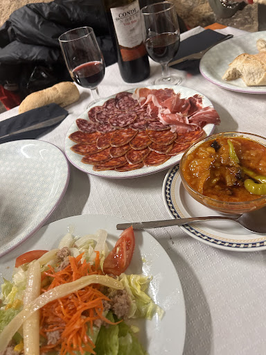 Read moreMás bien diré que es un buen lugar para no comer. Y me refiero a que después de esperar mas de tres cuartos de hora por una mesa, estuvimos esperando otra media hora por el primer plato, y otros tres cuartos de hora entre el primero y el segundo, y por desesperación marchamos sin tomar ni el postre. Eso por no hablar de lo que pidieron dos de mis acompañantes, que desafortunadamente pidieron chuletillas de lechazo, y debo decir que técnicamente eran chuletillas, ya que eran dos, yo que soy de buen comer me pedí el chuletón, que tiene un sobrecoste del menú de 2€, pero mi sorpresa fue que me pusieron un chuletín del tamaño de una chuleta de cerdo. Eso sí, os desaconsejo pedir la ensalada, ya que la traen de serie todos los platos para rellenar, las patatas fritas de la guarnición calculé que tendrían una semana de solera al menos. De meter miedo también son los baños, que se resumen a sendos inodoros metidos en un armario cada uno, y un lavabín en medio para compartir, donde la higiene brilla.... Pero por su ausencia. Algunos pensaréis que estoy exagerando, pero creedme que todo esto es cierto, yo creo que se dieron cuenta de la pésima calidad de su servicio, cuando al servirnos los segundos platos, nos oyeron quejarnos entre nosotros, y nos regalaron para compensar la tardanza dijeron, un platillo con seis lonchas de lomo y salchichón. Ciertamente me arrepentí mucho de llevar a ese antro a mi familia. Si queréis un buen trato y mejor servicio, caminad 100 m. hacia la plaza y en cualquier sitio quedareis contentos con el trato y la comida. Un...