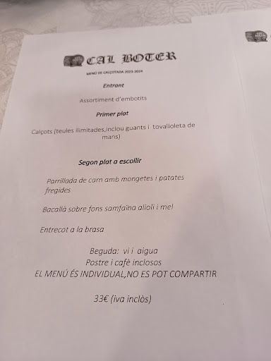 Read moreTienen dos menús uno de calçots 33€, Menú del dia 20€. Nosotros pedimos el menú calçots con muchas ganas de comer los primeros caçots de la temporada te vienen con un picoteo de embutido con pan . Los calçots son ilimitados pero... El problema está en la salsa , no pude disfrutar de los calçots por que honestamente nos sirvieron una salsa sin sabor con un color muy claro (creo que la alargaron un poco con agua para que rinda más) por el sabor y la textura líquida,de segundo plato elegimos la parrillada plato generoso pero sin mas..la butifarra i las mongetas muy buenas y bacalao decía que venía com un fondo de sanfaina i era solo salsa de tomate ,y el pescado estaba seco tenía un costra de estar pasado de cocción en el horno , por último los postres las natillas parecían caseras estaban buenas.