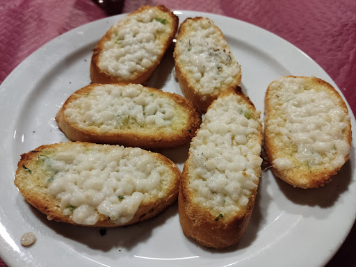 Una vez sentados, 20 minutos para tomar comanda. Fui para probar los canelones de ciervo y no les quedaban, al final pedimos pan de ajo con mozzarella, gnocchis, espaguetis y dos pizzas para los 4. Después de pedir, cuarenta minutos para traer la comida (25 el pan de ajo). Al final terminamos cenando a las 23:00, ya se nos había quitado el hambre.