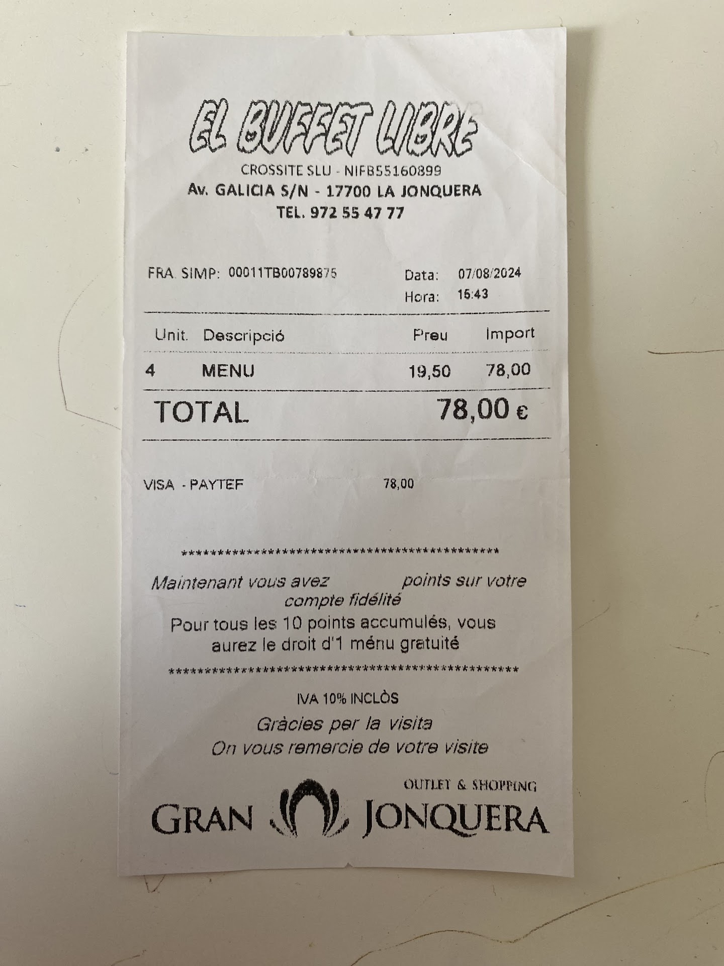 J'aurais dû regarder Google avant de revenir ici, cet endroit est noté 1,4/5 j'ai rarement vu des notes aussi basses pour un restaurant 😱. Je met une étoile parce que je n'ai pas la possibilité d'en mettre aucune. Nous étions venu plusieurs fois et globalement nous étions satisfait au regard du prix. Aujourd'hui notre expérience ne fut pas du tout satisfaisante.Tout d'abord la personne qui encaisse les repas à l'extérieur du restaurant est très désagréable, nous lui avons présenter notre carte fidélité où figurait 10 tampons, donc 10 repas pris dans cet établissement, il nous regarde, limite méprisant, et nous dit sur un ton très désagréable que celle-ci n'est plus valable et qu'on peut la jeter. Par contre il s'empresse de nous proposer une nouvelle carte où il n'y a pas moyen de mettre nos repas précédent. Qu'elle arnaque, avec notre précédente carte au 10ème repas il y en avait un d'offert. Et bien mon gars, ta carte tu peux te la garder ! Du coup sa commence plutôt mal et on aurait du partir à ce moment là 😕. La personne qui nous place à table est toute aussi désagréable que celui de l'entrée, je peux comprendre qu'ils voient énormément de monde mais il faut avoir conscience que c'est nous qui vous donnons, en quelques sortes, vos salaires, si plus personne ne vient vous irez pointer au chômage. Donc un peu d'amabilité, ou sinon changez de métier. Pas de verres sur notre table, nous essayons désespérément d'avoir un serveur pour le signaler, comme ils nous ignorent du coup nous partons en chercher. Après ces désagréments nous espérons profiter du buffet, mouai bof, pas grand chose dans nos assiettes, les mets proposés sont guère appétissants, il y a des assiettes sales, donc mon avis rejoint celui de nombreuses personnes venues ici, beurk, 🤮🤢 le vin rouge avait goût de vinaigre, comme ci il avait tourné, le rosé était encore pire. Mon mari a eu des crampes d'estomac tout au long de la route, pas cool quand on a encore 500 kilomètres à faire. Je ne m'attendais pas à des grands crus, mais surtout pas à de la vinasse comme ce qui est servi ici. Bref, vous l'aurez compris très mauvaise expérience pour nous, comme pour beaucoup d'autres personnes si on prend le temps de lire les commentaires, du coup nous ne reviendrons plus ici où la qualité à vraiment baissé et les prix ont eux augmentés car 21€ pour mal manger, je considère que c'est du vol. Nous trouverons donc d'autres endroits, ce qui ne manque pas ici a la Jonquera. Je tiens à préciser que ceci est un ressenti personnel fait en toute objectivité, et que ce n'est pas le premier avis que je laisse sur un restaurant,...