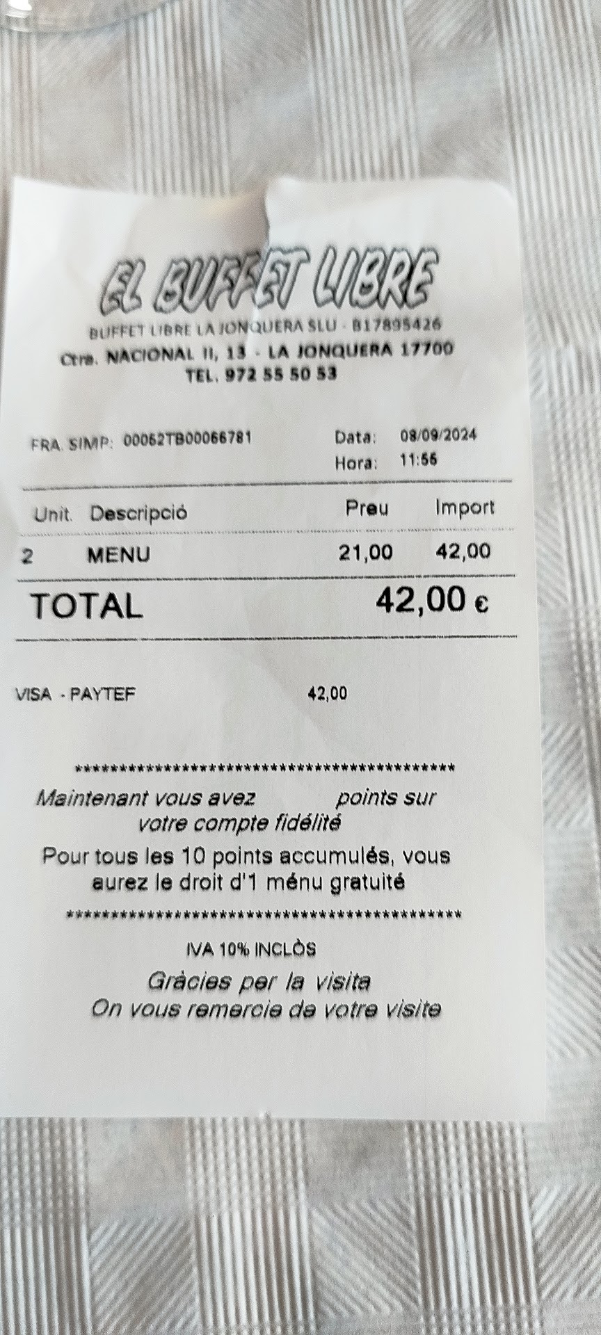 Read moreBonjour hier jai invité 2 amies a ce buffet libre et elles ont ete toutes les 2 beaucoup malade moi 1 peut moins la honte avec leur Zarzuela et paella qui je pense que la fraîcheur. était absente jai pris 1 steak il avait drole de couleur marron foncé avant quil me le cuise que je n ai pas mangé heureusement pour moi donc si vous ne voulez pas mourir évitez ce médiocre buffet ou il y a trop de plats qui pour moi reste des jours et des jours avant de les changer jai appellé le résponsable et il me dit que il y a que moi qui a fait 1 réclamation mais ca va venir. a fuir d urgence.-------------------------- Buenos dias ayer invité a 2 amigos a este buffet libre y los dos estaban muy enfermos, a mí me puede dar menos vergüenza con su zarzuela y paella que me parece fresca. estuvo ausente Tomé 1 filete, tenía un extraño color marrón oscuro antes de que él me lo cocinara, y afortunadamente no lo comí. así que si no quieres morir evita este buffet mediocre donde hay demasiados platos que para mí se quedan días y días antes de cambiarlos. Llamé al gerente y me dijo que solo fui yo quien puso 1 queja pero lo hará. venir. huir...