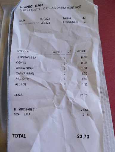 Read moreUna experiència dolenta. Després de fer una ruta pel Montsant i havent arribat al cotxe, he baixat a buscar dos Aquarius per mi i pel meu fill. He entrat al local i he anat directe a la barra. No m'he assentat en cap taula ni res. Ell simplement les ha agafat de sota la barra, on hi ha la nevera, i me les ha donat. M'ha clavat 4€. Ho trobo exageradament car. No ha hagut d'embrutar cap got, ni posar-hi llimona, ni servir-lo. Ho trobo francament excessiu. No sé si és el preu habitual o han volgut fer l'agost amb el primer "pardillo" que ha entrat. Lo que passa és que ja no sóc un "pardillo" i tinc una edat i prefereixo publicar-ho aquí que no queixar-me allà perquè teníem set i no volia quedar-me sense. Pregunteu preus! O si podeu, aguanteu una mica la set i aneu a Cornudella, que hi ha força oferta de bars i...