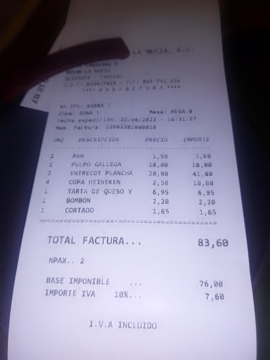 Read moreDesastroso, no suelo opinar, pero me parece que merece la pena hacer saber nuestra experiencia. Reservamos una paella a las 14:30, y hasta las 15:55 no llego, si el restaurante estuviera lleno lo entendería pero con 3 mesas me parece ridículo esperar tanto, las croquetas que pedimos de entrante por dentro congeladas, los chopitos blandos, evidentemente por el precio nos quejamos y por lo menos nos cambian croquetas y vuelven a freír los chopitos. Parece que no les sienta bien decirles que las cosas no están como debieran, una contestación nefasta de la camarera, me han dado ganas de levantarme y irme, la contestación hacia mi mujer por decirle que cuando iban a traer la carne para mí hijo por qué se le estaba quitando el hambre por la tardanza ha sido muy poco profesional. No volveré seguro, por cierto pedimos la paella socarrat y estaba pasadisima y ni un grano socarrat. Lo único la carne si...
