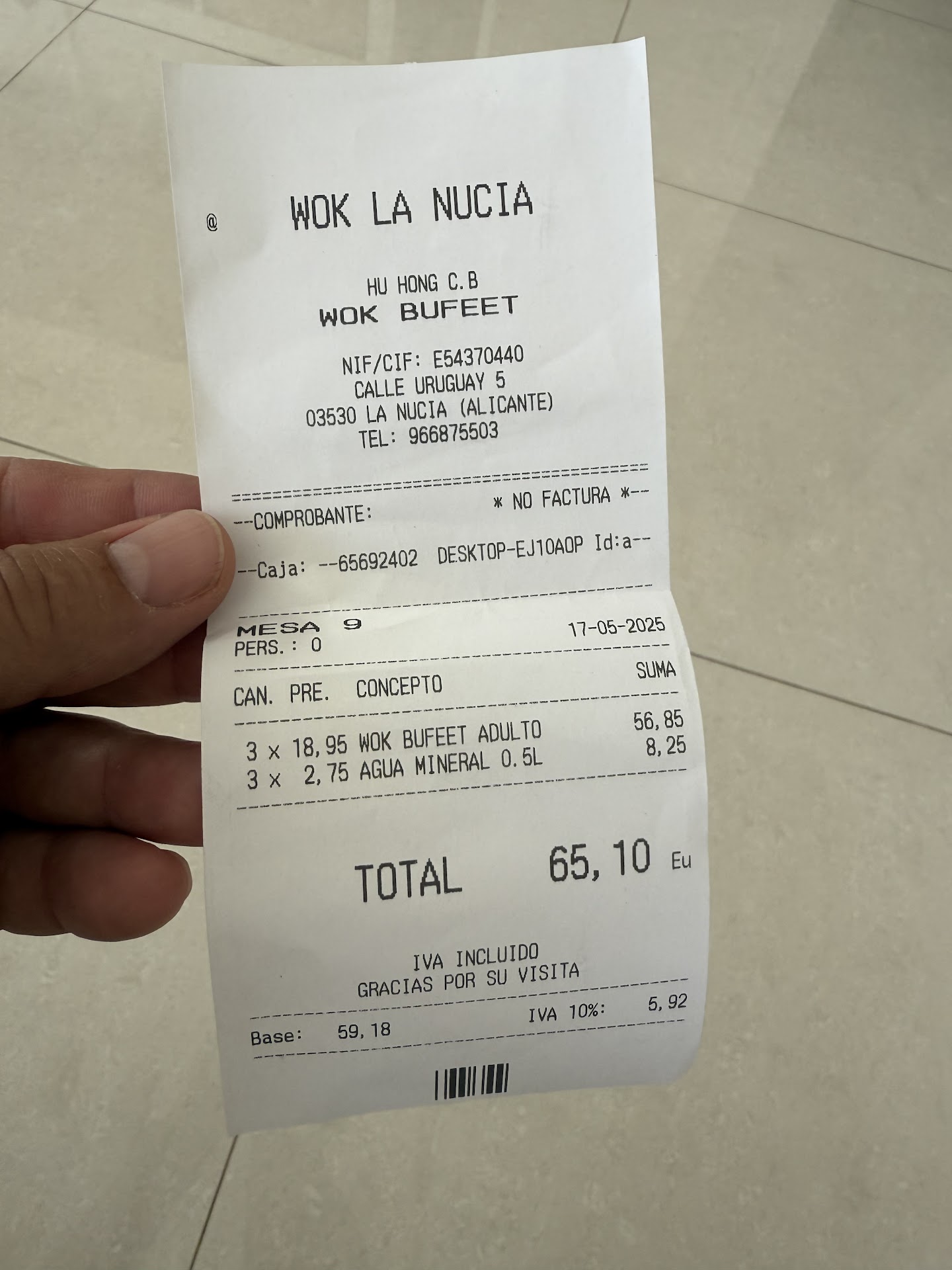 Read moreThat's a good place to go, but go there for the WOK ! Especially if you like sea foods and fish. The quality is there and the chef make it good, I recommend you the house sauce /salsa de la casa spicy but not too much ! There's lot's of others things you can get there but that's "standard" (low). The worst part is the dessert damm that was really poor. The place is big and clean if you want a good WOK go there if not then you should found another option. Drink is 2€ normal size big size is 3,50€. Meal cost...